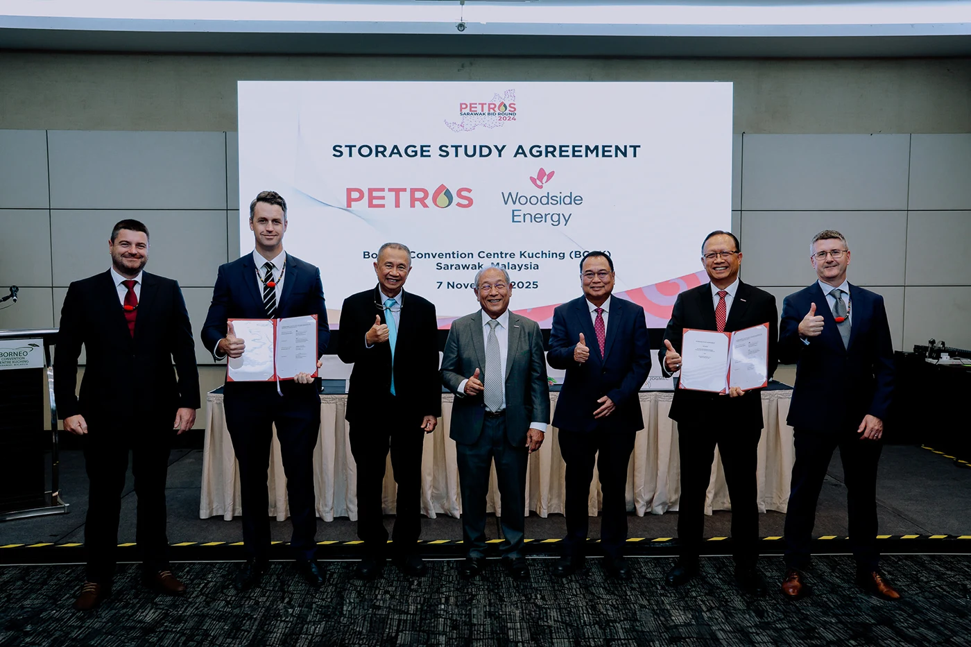 (Left to right) For the document exchange of the Storage Study Agreement, representing Woodside Energy was CCS Subsurface Manager, Robert Nesbit, CCS General Manager, Andrew Nicholls and Asia Pacific CCS Strategy and Business Development Manager, Keith Adamson. PETROS was represented by Senior Vice President for Sarawak Resource Management, Dato Abang Arabi Abang Narudin.