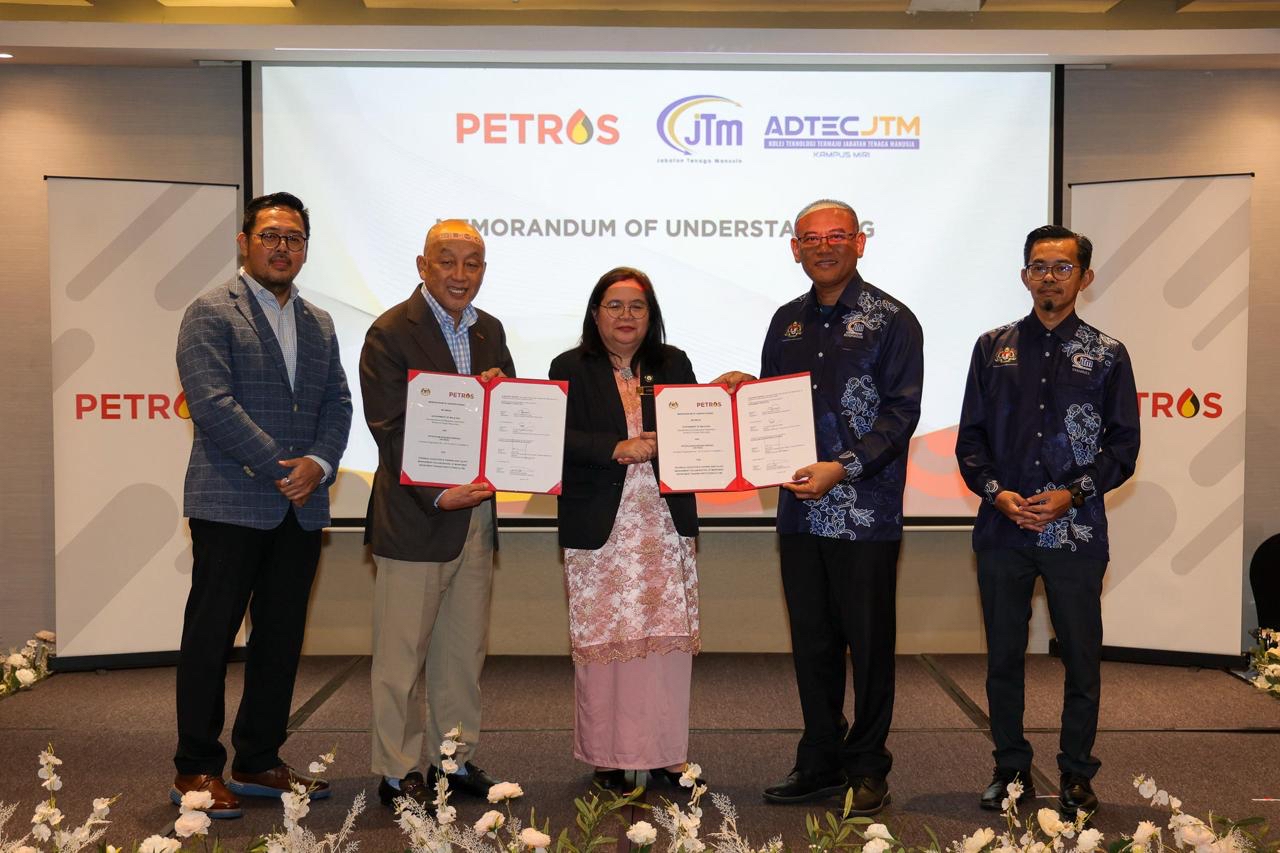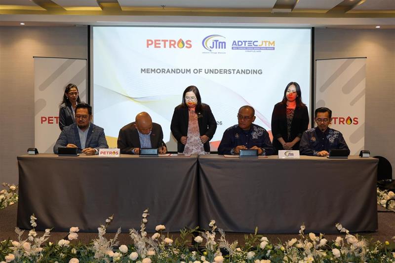 5 Mar 2026, Kuching - Petroleum Sarawak Berhad (PETROS) today formalised a Memorandum of Understanding (MoU) with Jabatan Tenaga Manusia (JTM), establishing a framework for collaboration with Advanced Technology Training Centre (ADTEC JTM) Miri Campus.